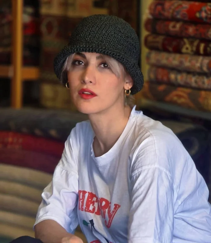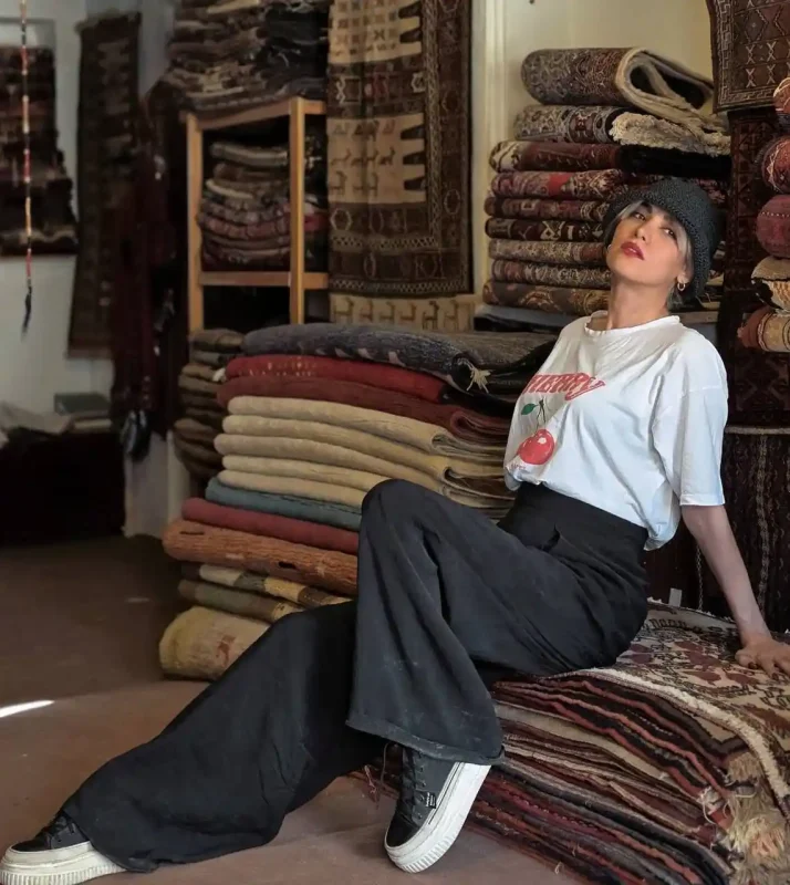 تصویر روز | استایل ساده ریحانه رضی در فرش فروشی‌های قدیمی اصفهان