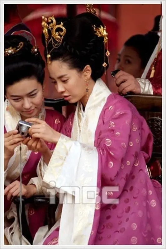 در اینجا تصویری از پشت صحنه سریال جومونگ را ملاحظه میکنید که در آن، پارک تام هی و سونگ جی هیو بازیگران نقشهای سولان و سویا در حال نگاه کردن عکسهایشان در صفحه نمایش دوربین دیجیتال هستند.