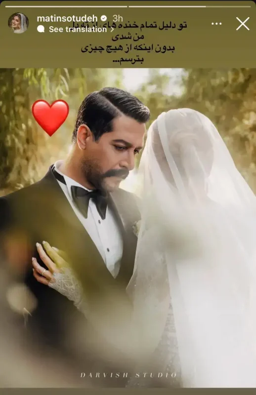 بازیگر سینما و تلویزیون، متین ستوده، با انتشار یک استوری احساسی، عمق علاقه خود به همسرش کامران تفتی را به نمایش گذاشت.