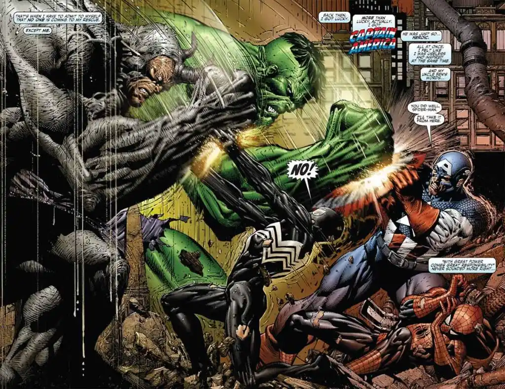 پس از ترور شدن کاپیتان آمریکا، اسپایدرمن آموزههای او را به یاد میآورد. یکی از آن درسها مربوط به هنگامی میشود که استیو راجرز یاد داد تا چگونه هماوردی بسیار قویتر از خودش را شکست دهد. در شماره ۴ کمیک Fallen Son: The Death of Captain America، اسپایدی یک رویارویی از کاپیتان آمریکا را در ذهن مرور میکند که در آن با مهارت بالا، وارد کردن ضربه پشت ضربه و گریز از ضربههای غول سبز به مبارزه میپردازد.